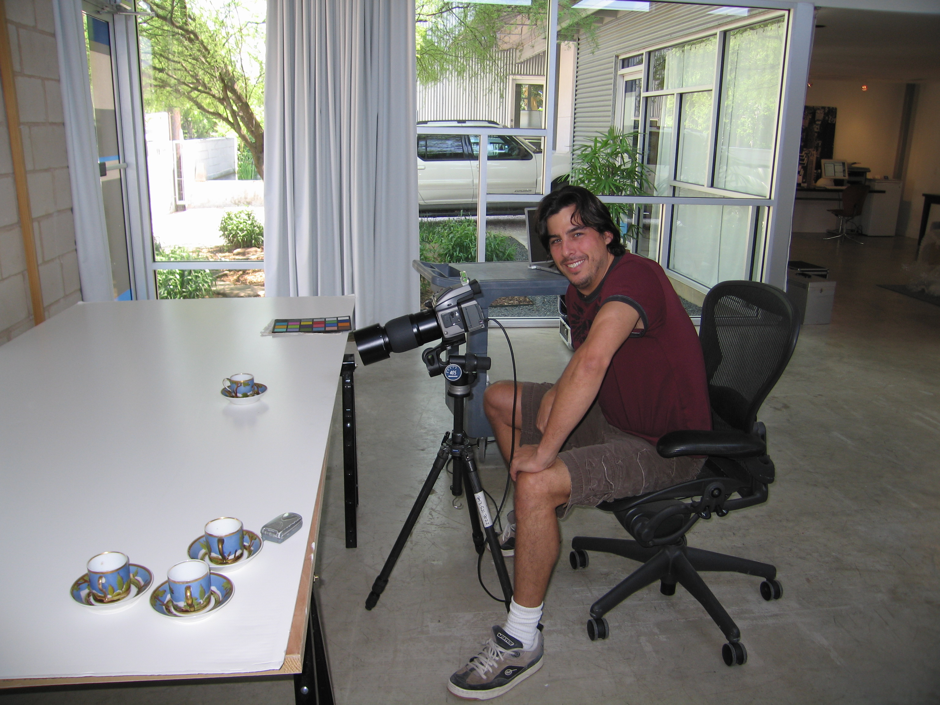 Lucky for me I like photographer Fulton Davenport as much as I do since he was perhaps our biggest repeat client over the years.  With his busy creative firm, PWL Studio, Fulton was shooting in our space practically every other week for years.  One of his specialties is product photography, which was also a specialty of ours.  Take a look at the photo above, of Fulton at work for a high-end antique shop client.  The tabletop set is comprised of expendables and hardware we kept in stock and offered at no extra charge.  Even more to the point of product photography was our studio’s unsurpassed natural light.  Heres Fulton on shooting day light in our space: